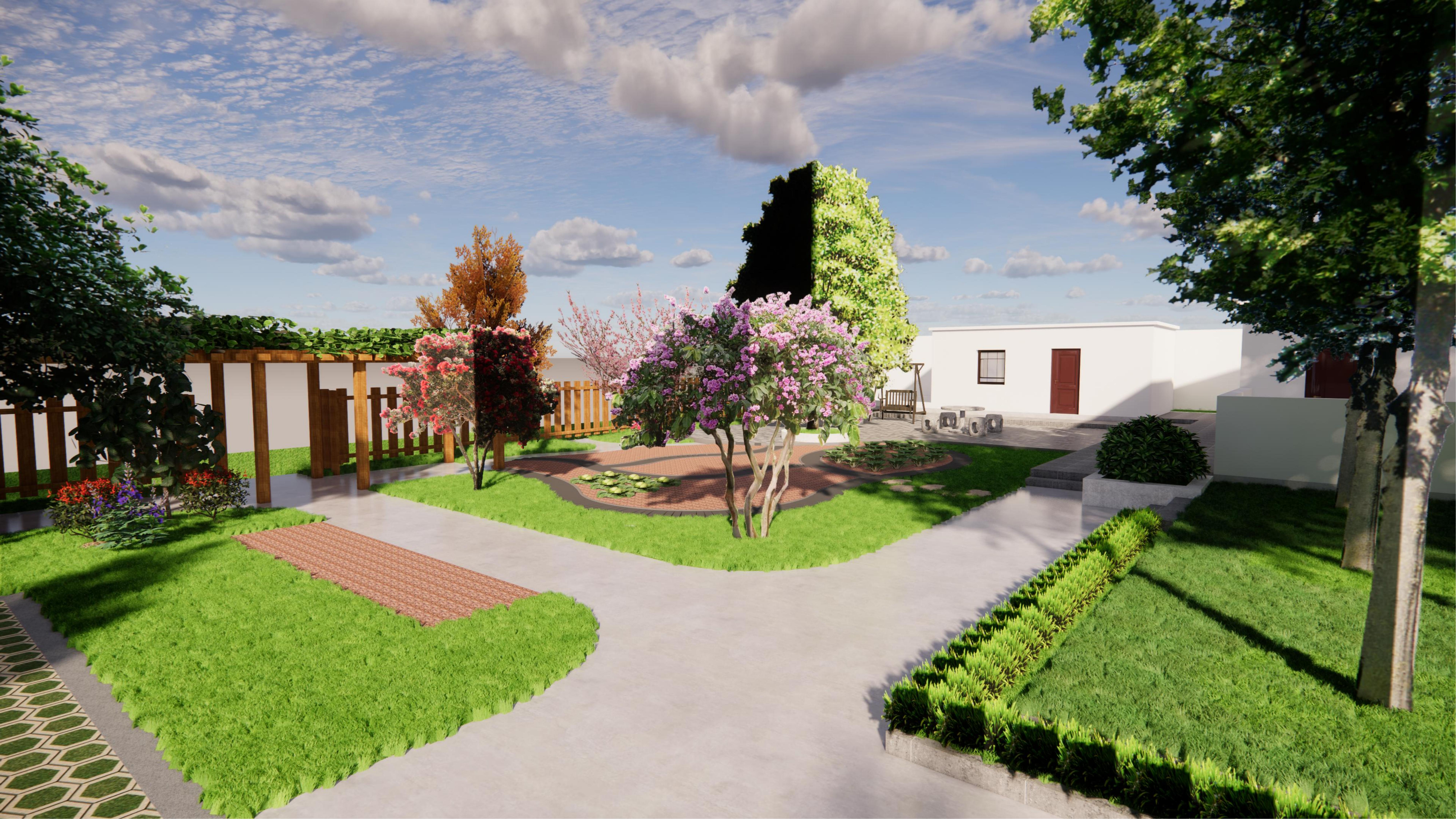 設(shè)計思路:在主體建筑的東側(cè),采用陣列的方式栽種9株中等落葉喬木,一是為了降低太陽光對陽光房的直射溫度,二是營造貼近自然的生活環(huán)境,三也不會影響冬日的陽光采集。在主體建筑的正南方,采用業(yè)主家多余的青磚進(jìn)行鋪地,使整個庭院的風(fēng)格更加的淳樸自然。