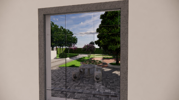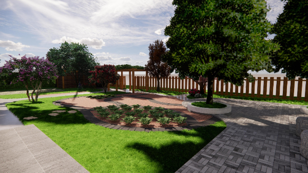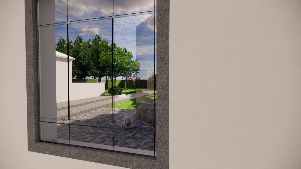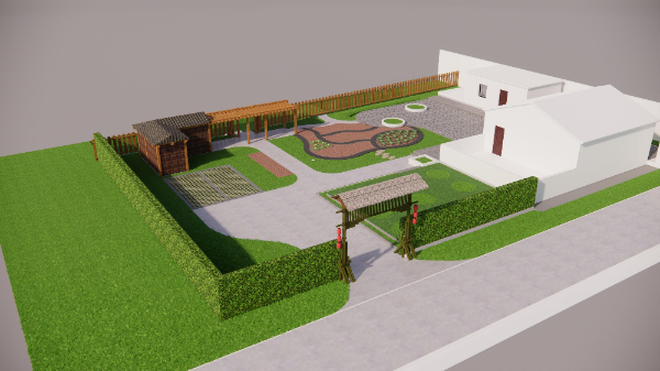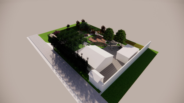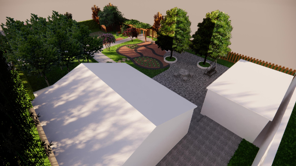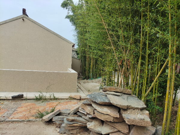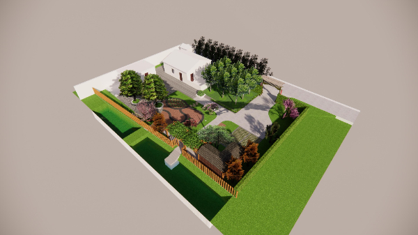 設(shè)計思路:在主體建筑的東側(cè),采用陣列的方式栽種9株中等落葉喬木,一是為了降低太陽光對陽光房的直射溫度,二是營造貼近自然的生活環(huán)境,三也不會影響冬日的陽光采集。在主體建筑的正南方,采用業(yè)主家多余的青磚進(jìn)行鋪地,使整個庭院的風(fēng)格更加的淳樸自然。